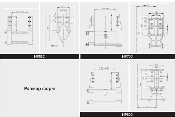 Конструкция закрывания форм с трёх- или четырёхнаправляющими колонками.